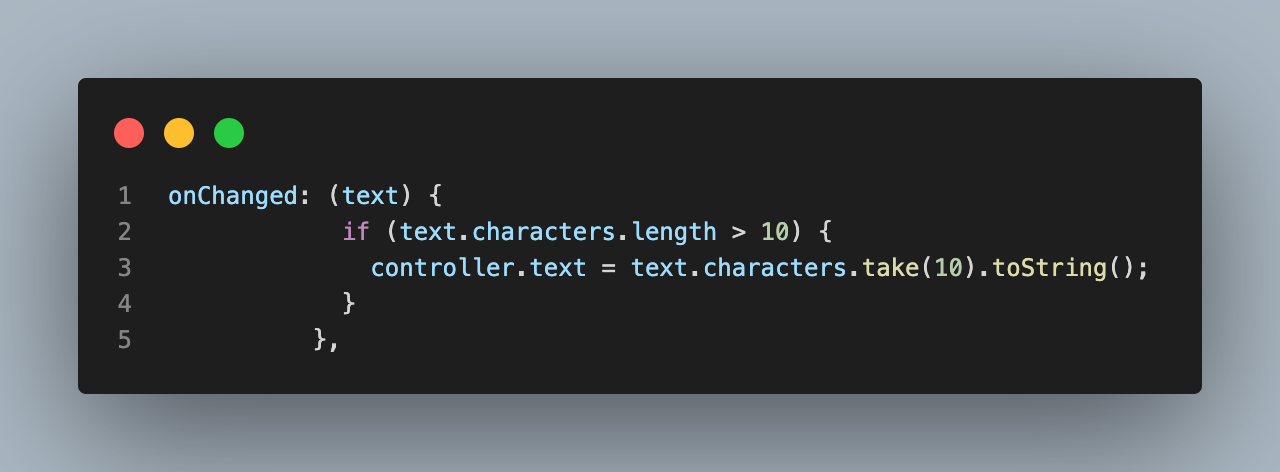 TextEditingController를 사용하여 입력된 텍스트의 길이를 실시간으로 체크하도록 해준다. onChaged를 통해 입력하는 동안 글자수를 확인하도록 하고 10자를 초과하는 경우 입력을 제한한다.